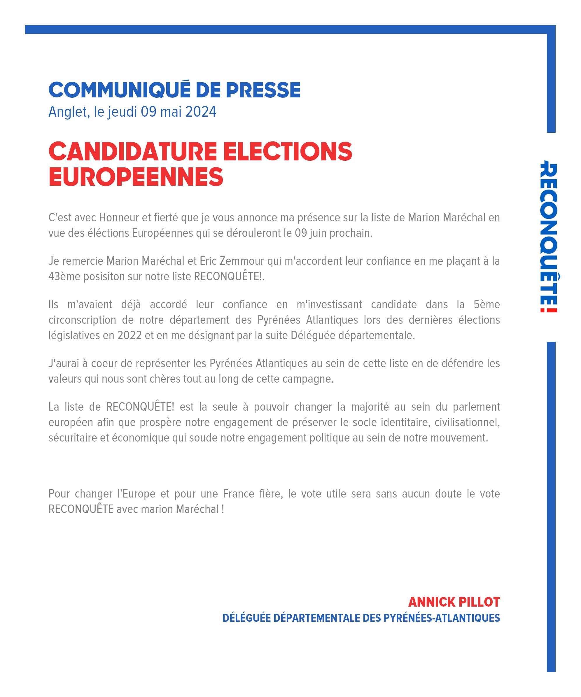 Je remercie Marion Maréchal et Eric Zemmour qui m'accordent leur confiance en me plaçant à la 43ème posisiton sur notre liste RECONQUÊTE!.